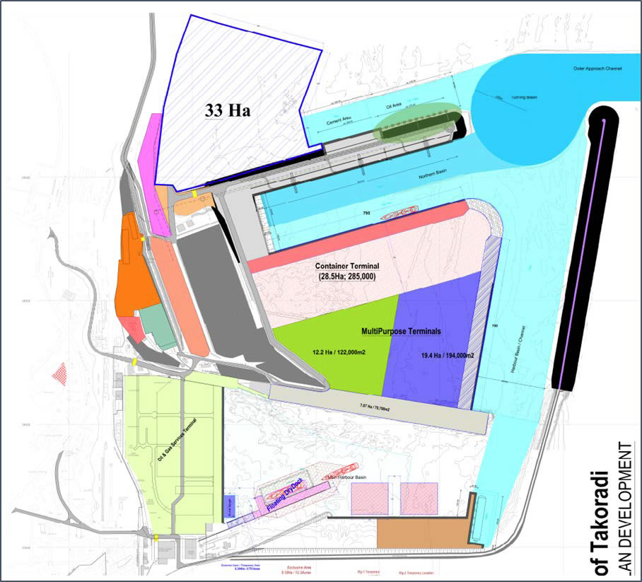 The project is part of the Master Plan for the Port of Takoradi (2015). The Master Plan concerns the outlook for the Port of Takoradi in terms of future trade and land use, while the Development Project concerns the first phase of the connected port infrastructure construction works